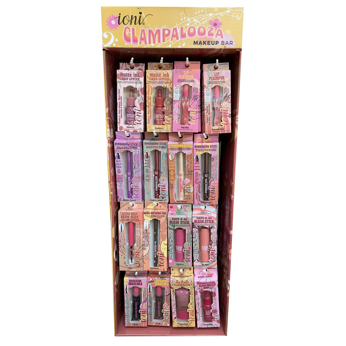 Display de 96 piezas de productos variados de Ioni Cosmetics para exhibición y venta, perfecto para comenzar o expandir tu negocio de belleza con lo mejor de la colección Glam Palooza.