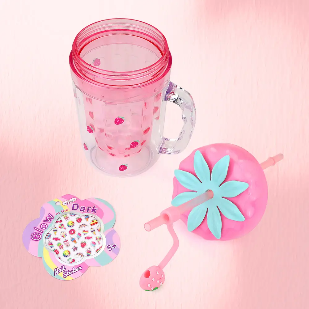 Tarro estilo Mason Jar HOT FOCUS de 400 ml con tapa en forma de fresa, popote y stickers para uñas. Divertido y reutilizable.